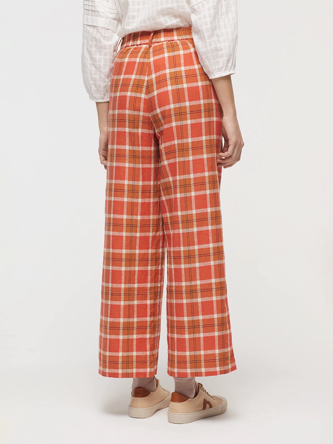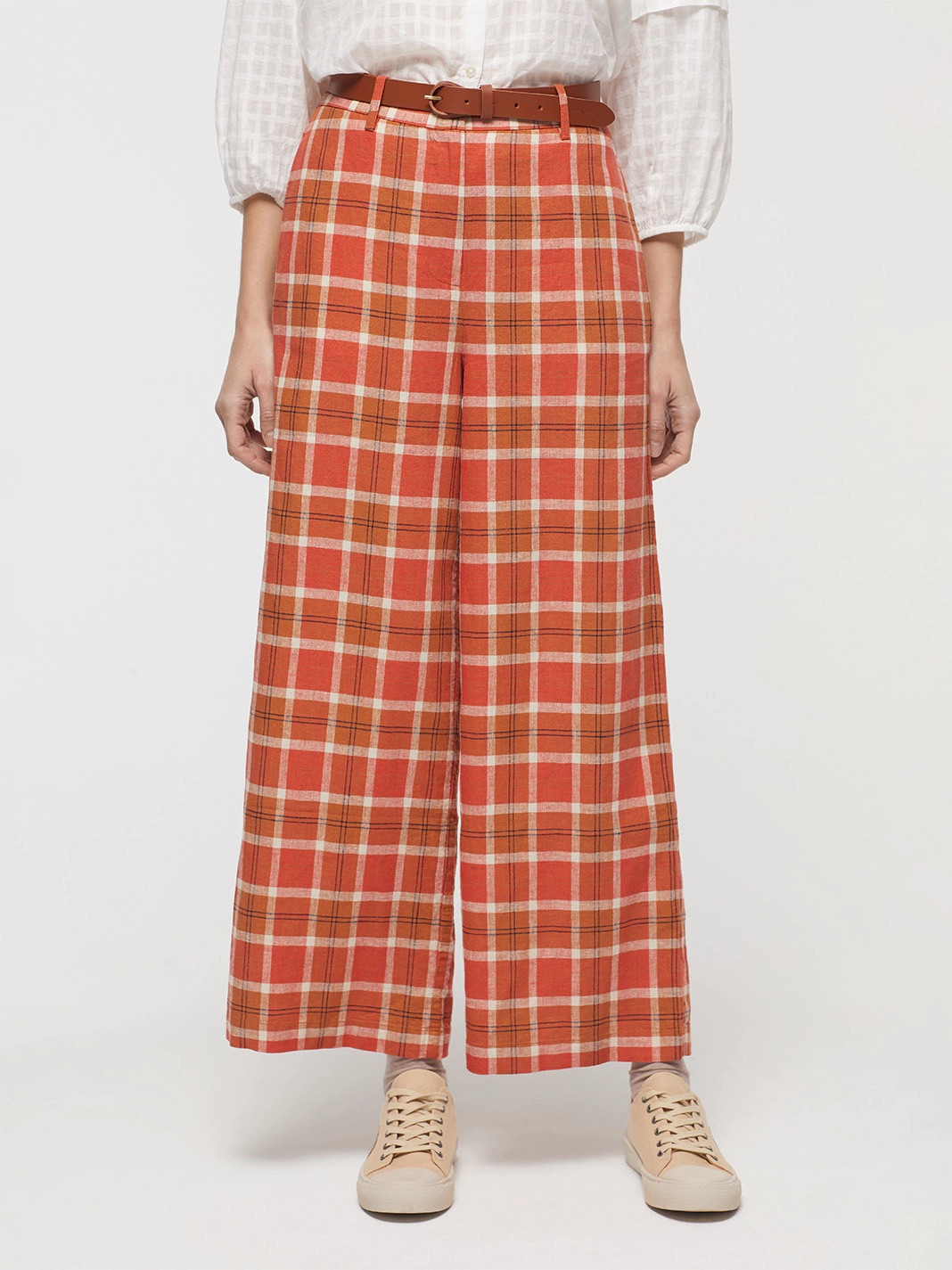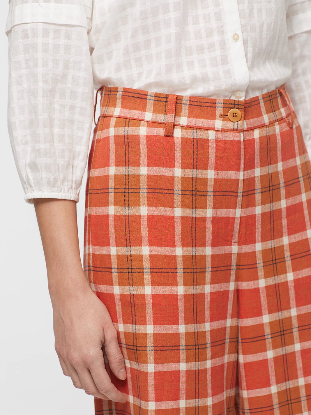 Pantalon à carreaux multicolores tissé en lin mélangé.